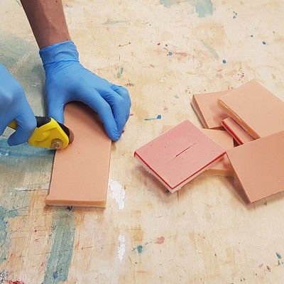 We regularly produce surgical suture pads using two-component silicone and fat tissue mimicking fillers. Students first use these to practice using surgical suture thread and various stitching techniques.
